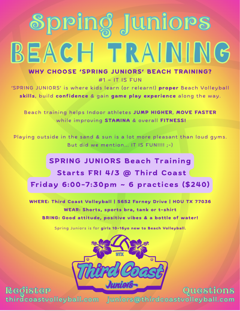 Beach Training Travel Team Drop-In Training Tournaments Coaches College Coach Clinic SPRING BEACH VOLLEYBALL TRAINING Spring Beach Volleyball Training Registration is Now Open Registration